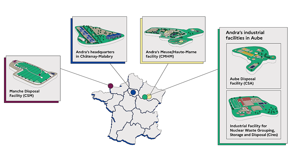 Andra’s activities are spread across five sites located in the Île-de-France region, in Normandy, in the Aube department (CSA and Cires), and in the Grand Est region.